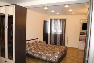 Номер класса люкс в коттедже «Артема 31» предлагает к услугам постояльцев удобную двуспальную кровать, большой платяной шкаф, диванную зону с кофейным столиком и просторную ванную комнату. Прекрасный вид на город и комфортное обслуживание создают атмосферу уюта.